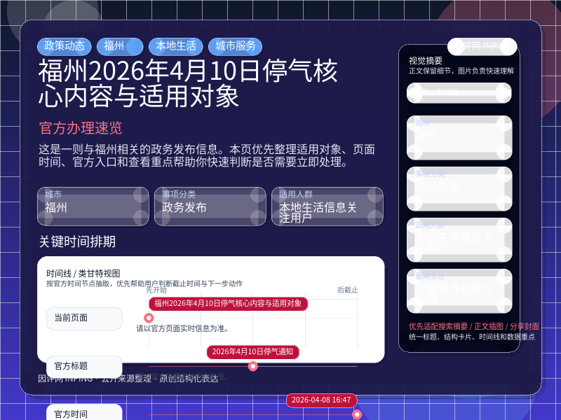 这项信息由 福州通知公告 发布,围绕“福州2026年4月10日停气核心内容与适用对象”整理为便于直接查看的本地生活页。进入页面后,先看自己是否属于适用对象,再看政策重点和官方说明。