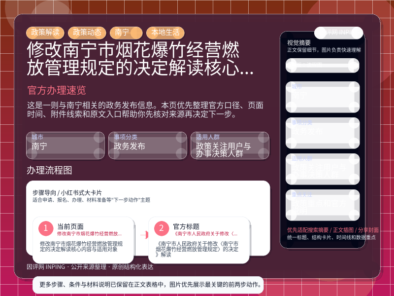 这项信息由 南宁政策解读 发布,围绕“修改南宁市烟花爆竹经营燃放管理规定的决定解读核心内容与适用对象”整理为官方口径优先的本地生活页。进入页面后,先核对原文入口、页面时间和附件,再看政策重点和官方说明。
