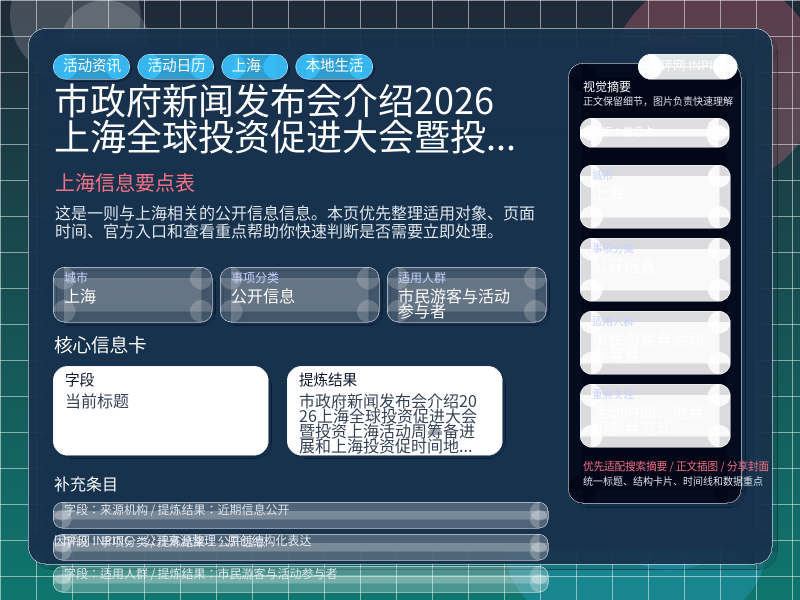 上海公开信息整理,围绕“市政府新闻发布会介绍2026上海全球投资促进大会暨“投资上海”活动周筹备进展和上海投资促进工作相关情况”提炼为可检索、可阅读的原创结构化内容,优先展示时间、对象、入口和行动建议,来源:近期信息公开。