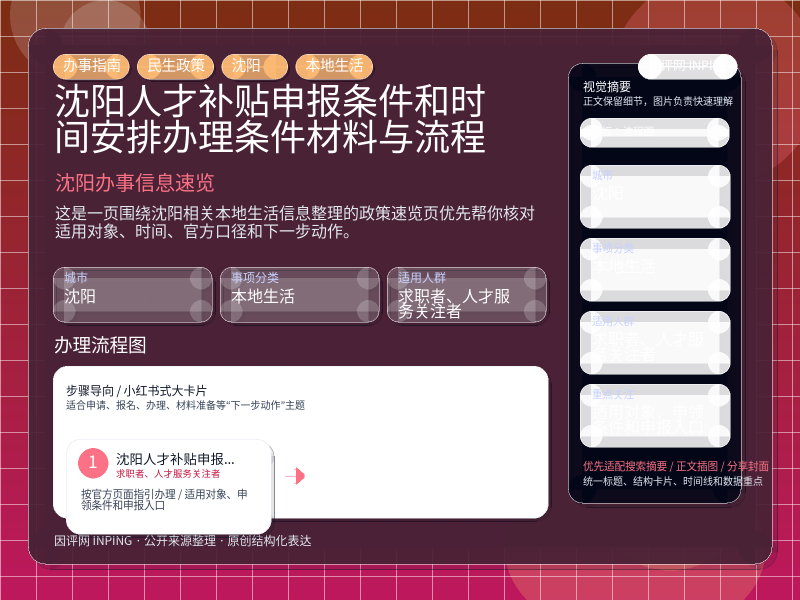 这项信息由 www.inping.com 发布,围绕“沈阳人才补贴申报条件和时间安排办理条件材料与流程”整理为政策速览页。进入页面后,先核对适用对象、时间和官方口径,再看适用对象、申领条件和申报入口。