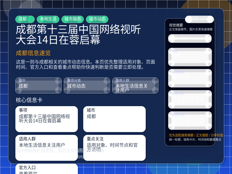 成都城市动态整理,围绕“第十三届中国网络视听大会14日在蓉启幕”提炼为可检索、可阅读的原创结构化内容,优先展示时间、对象、入口和行动建议,来源:成都要闻。
