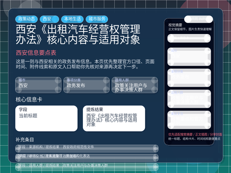 这项信息由 西安政府规范性文件 发布,围绕“西安《出租汽车经营权管理办法》核心内容与适用对象”整理为官方口径优先的本地生活页。进入页面后,先核对原文入口、页面时间和附件,再看政策重点和官方说明。