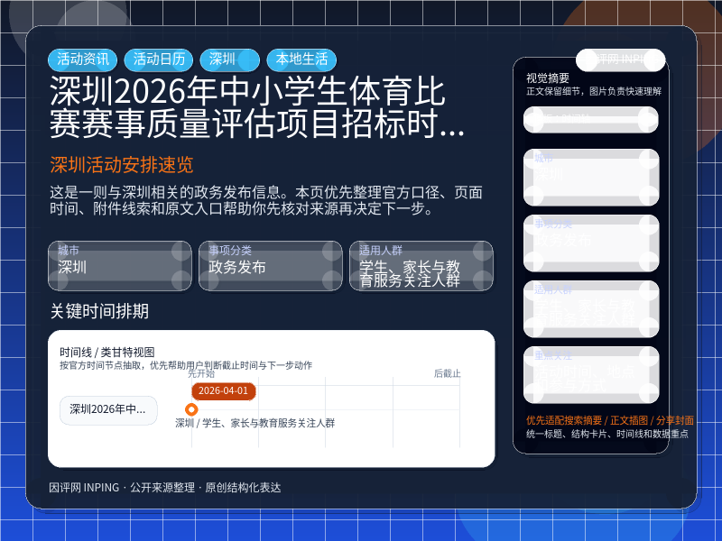 深圳政务发布整理,围绕“2026年中小学生体育比赛赛事质量评估项目招标公告”提炼为可检索、可阅读的原创结构化内容,优先展示时间、对象、入口和行动建议,来源:深圳通知公告。