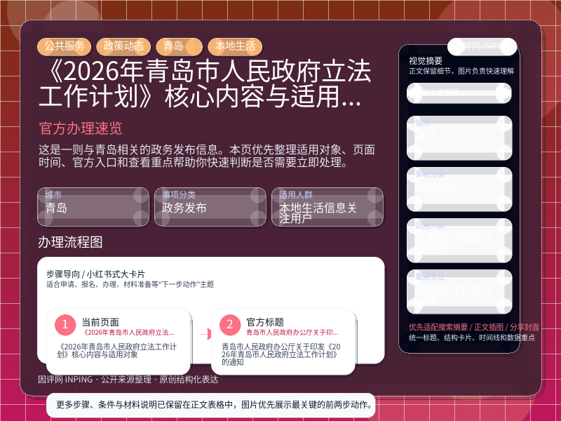 这条信息当前更适合 本地生活信息关注用户 重点关注。如果你正准备处理“《2026年青岛市人民政府立法工作计划》核心内容与适用对象”相关事项,建议先结合自身身份、所属行业或所在区域判断是否属于适用对象。