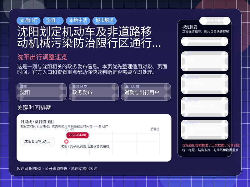 沈阳政务发布整理,围绕“沈阳市人民政府关于划定机动车及非道路移动机械污染防治限行区的通告”提炼为可检索、可阅读的原创结构化内容,优先展示时间、对象、入口和行动建议,来源:沈阳政府公告。
