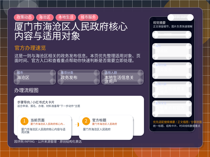 这项信息由 海沧区首页聚合 发布,围绕“厦门市海沧区人民政府核心内容与适用对象”整理为便于直接查看的本地生活页。进入页面后,先看自己是否属于适用对象,再看政策重点和官方说明。