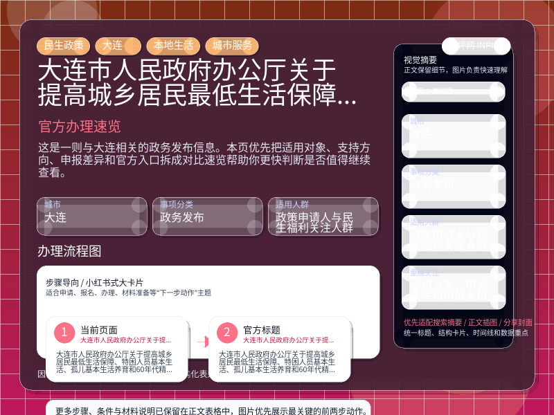 大连政务发布整理,围绕“大连市人民政府办公厅关于提高城乡居民最低生活保障、特困人员基本生活、孤儿基本生活养育和60年代精简退职职工生活补助标准的通知”提炼为可检索、可阅读的原创结构化内容,优先展示时间、对象、入口和行动建议,来源:大连市政府办公厅文件。