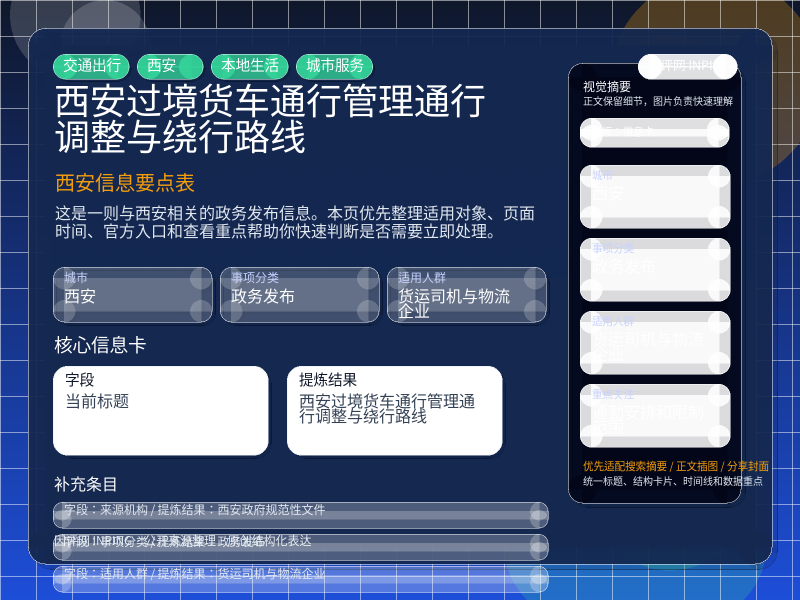 西安政务发布整理,围绕“西安市人民政府关于过境货车通行管理的通告”提炼为可检索、可阅读的原创结构化内容,优先展示时间、对象、入口和行动建议,来源:西安政府规范性文件。