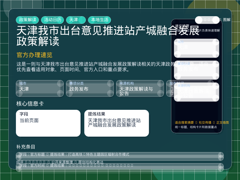 这项信息由 天津政策解读与公告 发布,主要帮助你快速确认“天津我市出台意见推进站产城融合发展政策解读”是否与自己有关,以及适用对象、执行时间和官方说明。