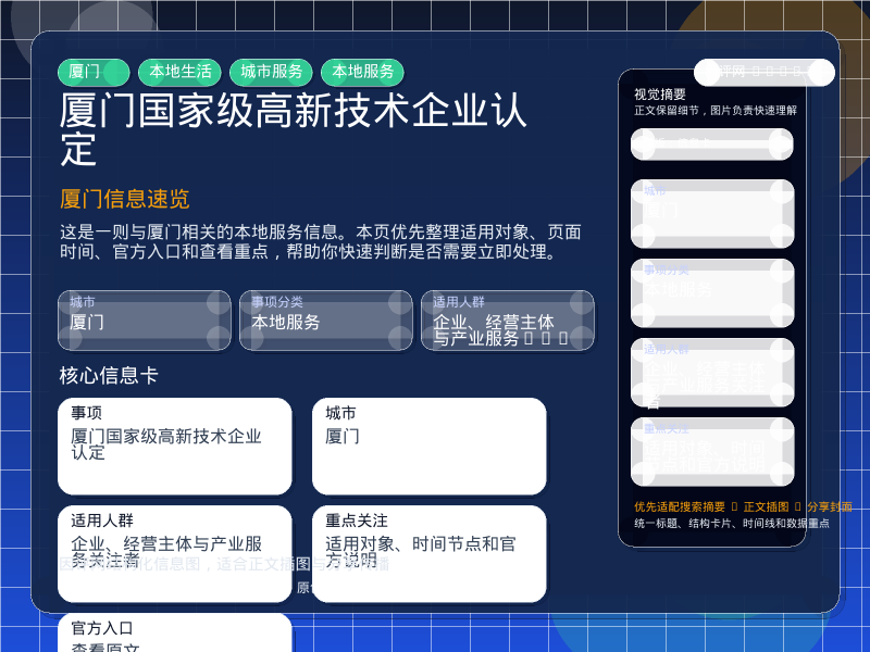 厦门本地服务整理,围绕“国家级高新技术企业认定”提炼为可检索、可阅读的原创结构化内容,优先展示时间、对象、入口和行动建议,来源:厦门专题服务。