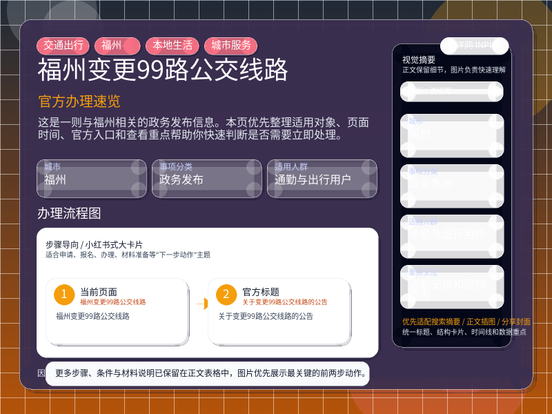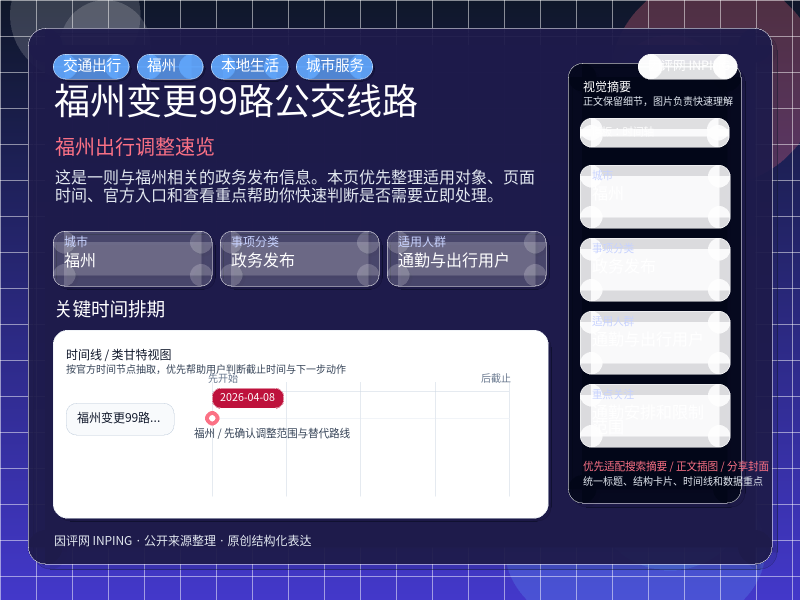这条信息当前更适合 通勤与出行用户 重点关注。如果你正准备处理“福州变更99路公交线路”相关事项,建议先结合自身身份、所属行业或所在区域判断是否属于适用对象。