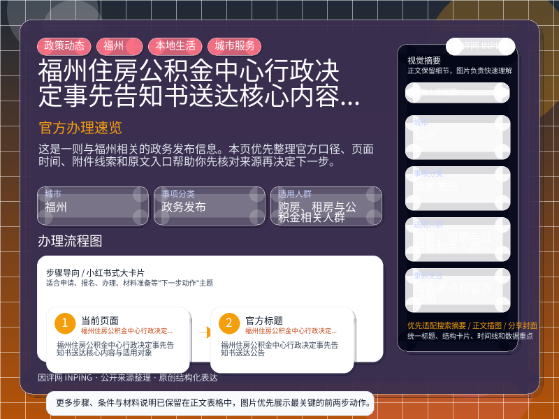 这项信息由 福州通知公告 发布,围绕“福州住房公积金中心行政决定事先告知书送达核心内容与适用对象”整理为官方口径优先的本地生活页。进入页面后,先核对原文入口、页面时间和附件,再看政策重点和官方说明。