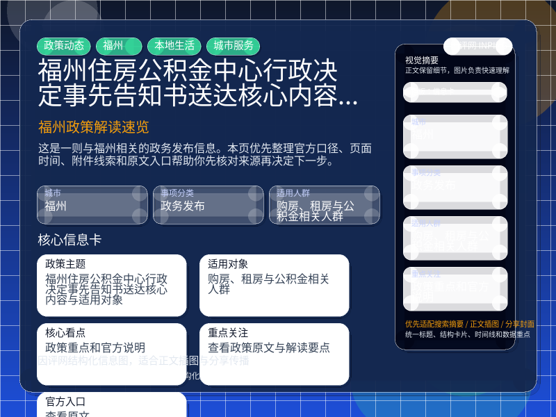 福州政务发布整理,围绕“福州住房公积金中心行政决定事先告知书送达公告”提炼为可检索、可阅读的原创结构化内容,优先展示时间、对象、入口和行动建议,来源:福州通知公告。