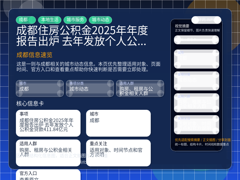 成都城市动态整理,围绕“《成都住房公积金2025年年度报告》出炉 去年发放个人公积金贷款411.84亿元”提炼为可检索、可阅读的原创结构化内容,优先展示时间、对象、入口和行动建议,来源:成都要闻。