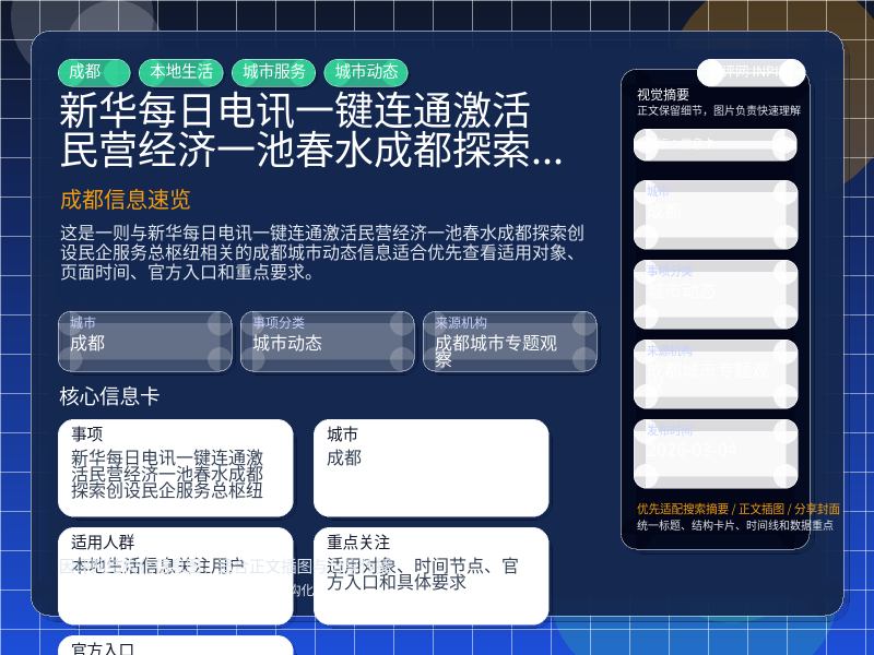 这是一则与“新华每日电讯:一键连通激活民营经济一池春水——成都探索创设民企服务总枢纽”相关的成都城市动态信息,适合优先查看适用对象、页面时间、官方入口和重点要求。