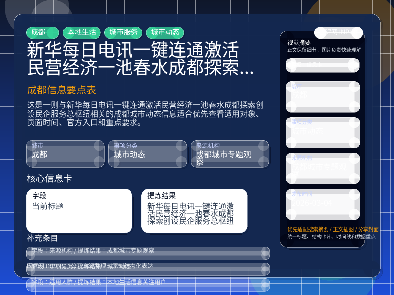 成都城市动态整理,围绕“新华每日电讯:“一键连通”激活民营经济“一池春水”——成都探索创设民企服务“总枢纽””提炼为可检索、可阅读的原创结构化内容,优先展示时间、对象、入口和行动建议,来源:成都城市专题观察。