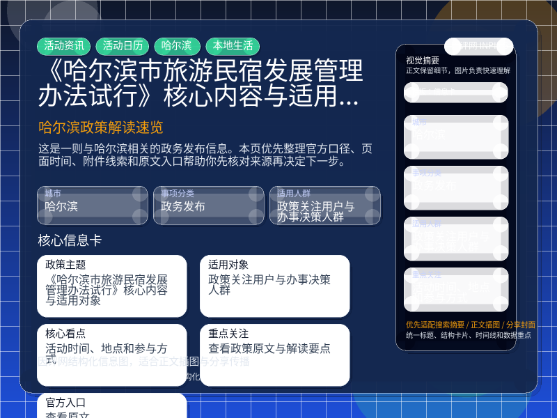 这项信息由 哈尔滨规范性文件 发布,围绕“《哈尔滨市旅游民宿发展管理办法(试行)》核心内容与适用对象”整理为官方口径优先的本地生活页。进入页面后,先核对原文入口、页面时间和附件,再看活动时间、地点和参与方式。