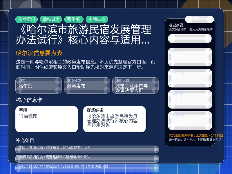 这条信息当前更适合 政策关注用户与办事决策人群 重点关注。如果你正准备处理“《哈尔滨市旅游民宿发展管理办法(试行)》核心内容与适用对象”相关事项,建议先结合自身身份、所属行业或所在区域判断是否属于适用对象。