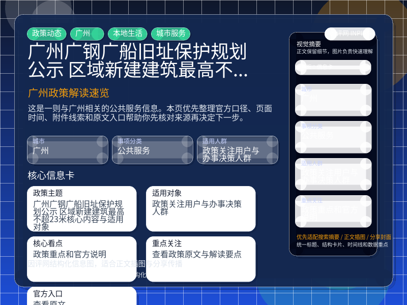 这项信息由 广州公共服务资讯 发布,围绕“广州广钢—广船旧址保护规划公示 区域新建建筑最高不超23米核心内容与适用对象”整理为官方口径优先的本地生活页。进入页面后,先核对原文入口、页面时间和附件,再看政策重点和官方说明。