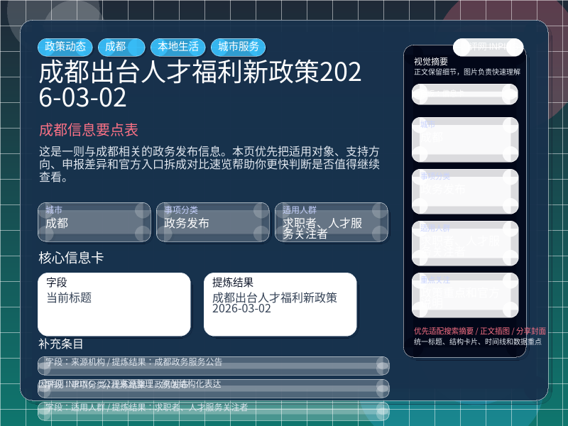 成都政务发布整理,围绕“成都出台人才福利新政策 2026-03-02”提炼为可检索、可阅读的原创结构化内容,优先展示时间、对象、入口和行动建议,来源:成都政务服务公告。
