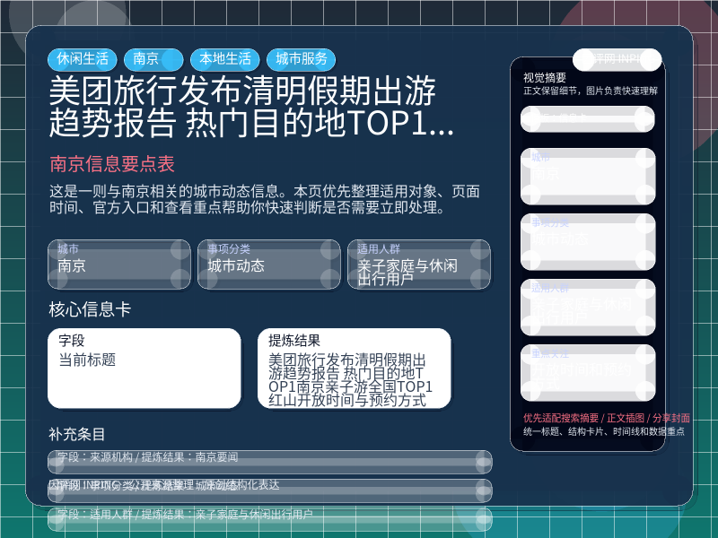 南京城市动态整理,围绕“美团旅行发布清明假期出游趋势报告 热门目的地TOP1:南京!亲子游全国TOP1:红山森林动物园!”提炼为可检索、可阅读的原创结构化内容,优先展示时间、对象、入口和行动建议,来源:南京要闻。
