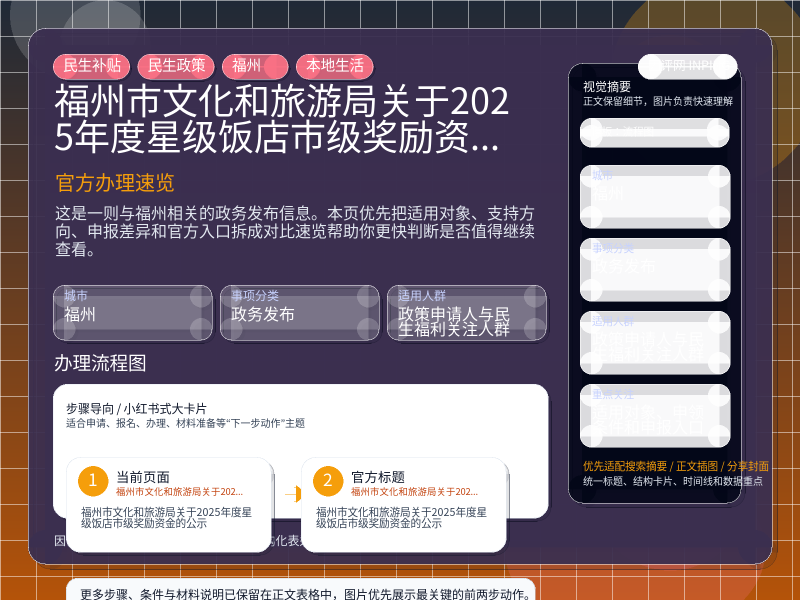 | 福州市文化和旅游局关于2025年度星级饭店市级奖励资金的公示 | 政策申请人与民生福利关注人群 | 适用对象、申领条件和申报入口 | 先确认条件、金额和申报时间 | 查看原文 |