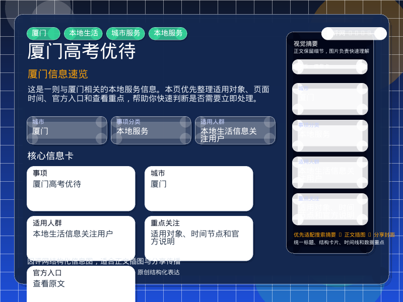 厦门本地服务整理,围绕“高考优待”提炼为可检索、可阅读的原创结构化内容,优先展示时间、对象、入口和行动建议,来源:厦门专题服务。
