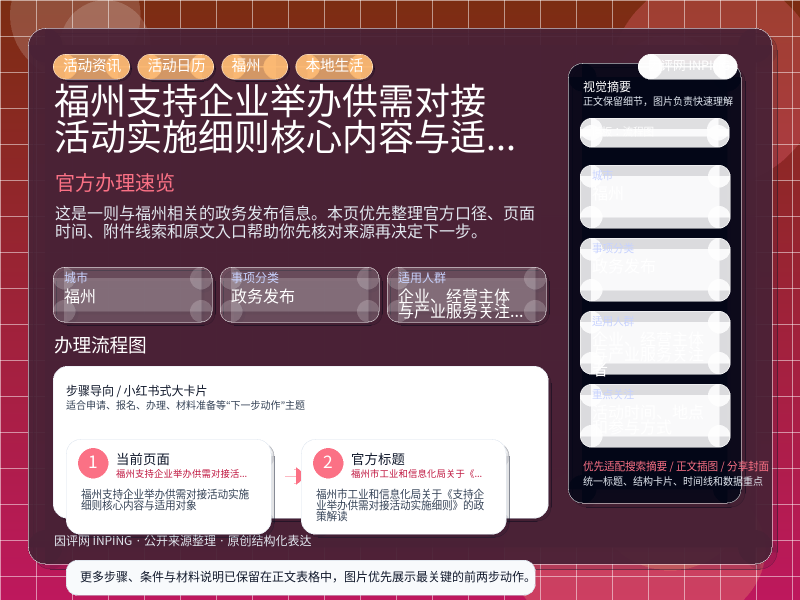 这项信息由 福州本市政策解读 发布,围绕“福州支持企业举办供需对接活动实施细则核心内容与适用对象”整理为官方口径优先的本地生活页。进入页面后,先核对原文入口、页面时间和附件,再看活动时间、地点和参与方式。