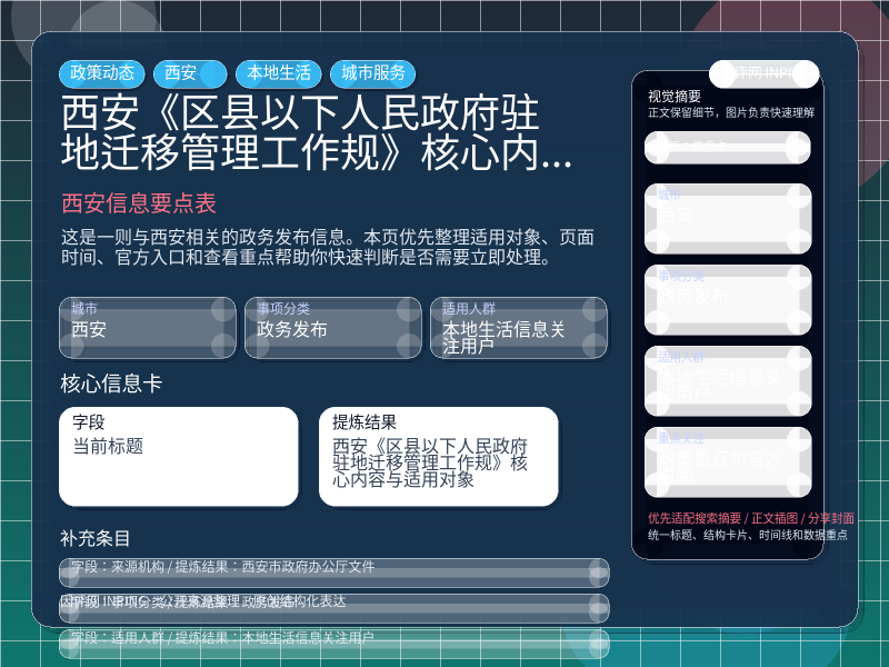 这条信息当前更适合 本地生活信息关注用户 重点关注。如果你正准备处理“西安《区县以下人民政府驻地迁移管理工作规》核心内容与适用对象”相关事项,建议先结合自身身份、所属行业或所在区域判断是否属于适用对象。