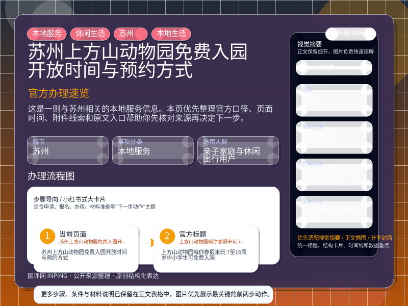 这条信息当前更适合 亲子家庭与休闲出行用户 重点关注。如果你正准备处理“苏州上方山动物园免费入园开放时间与预约方式”相关事项,建议先结合自身身份、所属行业或所在区域判断是否属于适用对象。
