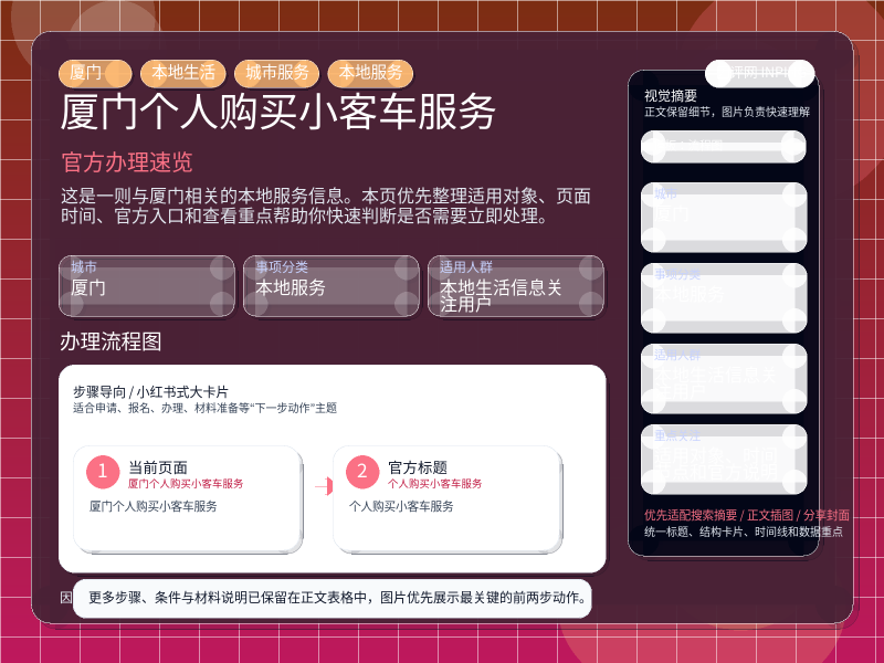 厦门本地服务整理,围绕“个人购买小客车服务”提炼为可检索、可阅读的原创结构化内容,优先展示时间、对象、入口和行动建议,来源:厦门专题服务。