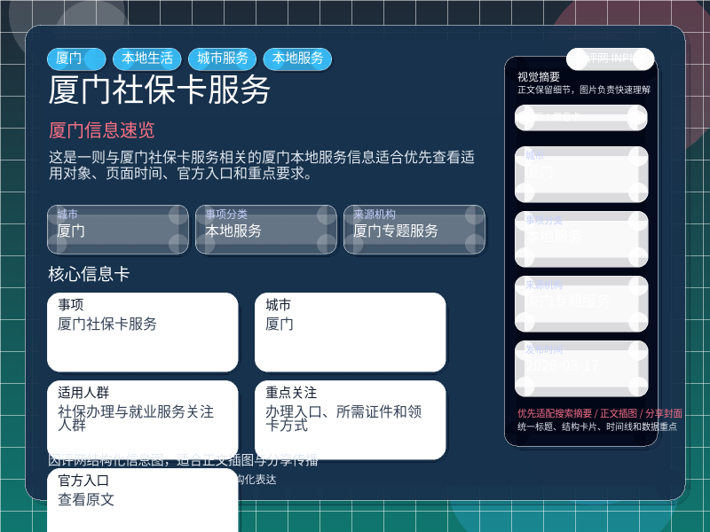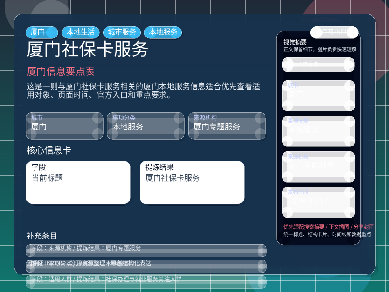 厦门本地服务整理,围绕“社保卡服务”提炼为可检索、可阅读的原创结构化内容,优先展示时间、对象、入口和行动建议,来源:厦门专题服务。