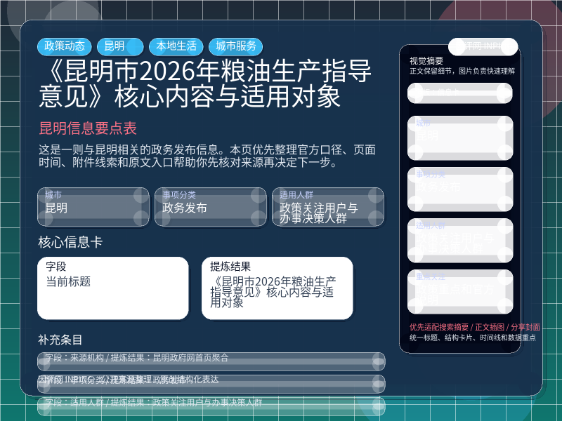 这项信息由 昆明政府网首页聚合 发布,围绕“《昆明市2026年粮油生产指导意见》核心内容与适用对象”整理为官方口径优先的本地生活页。进入页面后,先核对原文入口、页面时间和附件,再看政策重点和官方说明。