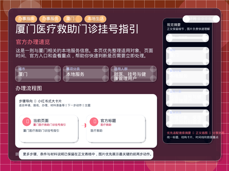 厦门本地服务整理,围绕“医疗救助”提炼为可检索、可阅读的原创结构化内容,优先展示时间、对象、入口和行动建议,来源:厦门专题服务。