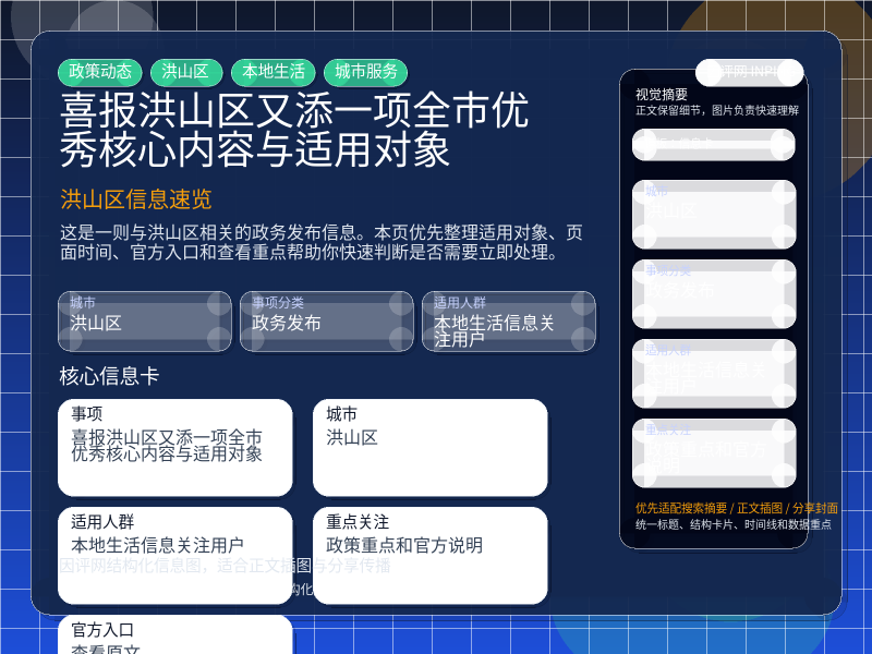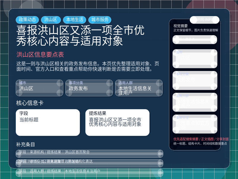 这条信息当前更适合 本地生活信息关注用户 重点关注。如果你正准备处理“喜报!洪山区又添一项全市优秀核心内容与适用对象”相关事项,建议先结合自身身份、所属行业或所在区域判断是否属于适用对象。
