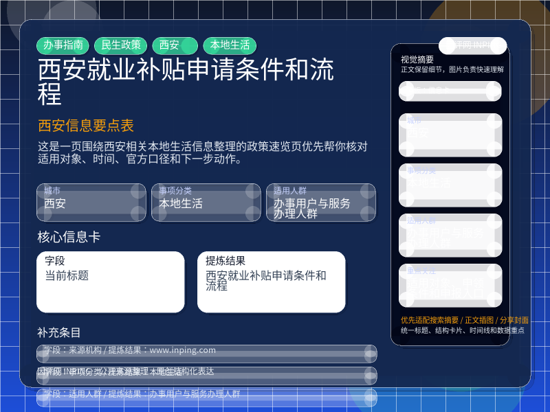 这项信息由 www.inping.com 发布,围绕“西安就业补贴申请条件和流程”整理为政策速览页。进入页面后,先核对适用对象、时间和官方口径,再看适用对象、申领条件和申报入口。