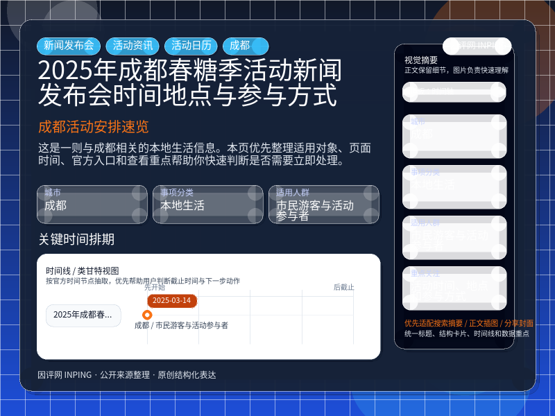 成都本地生活整理,围绕“2025年成都春糖季活动新闻发布会”提炼为可检索、可阅读的原创结构化内容,优先展示时间、对象、入口和行动建议,来源:成都新闻发布会。