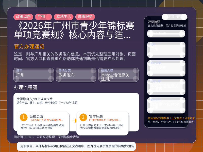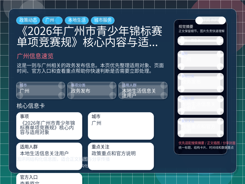 这项信息由 广州通知公告 发布,围绕“《2026年广州市青少年锦标赛单项竞赛规》核心内容与适用对象”整理为便于直接查看的本地生活页。进入页面后,先看自己是否属于适用对象,再看政策重点和官方说明。