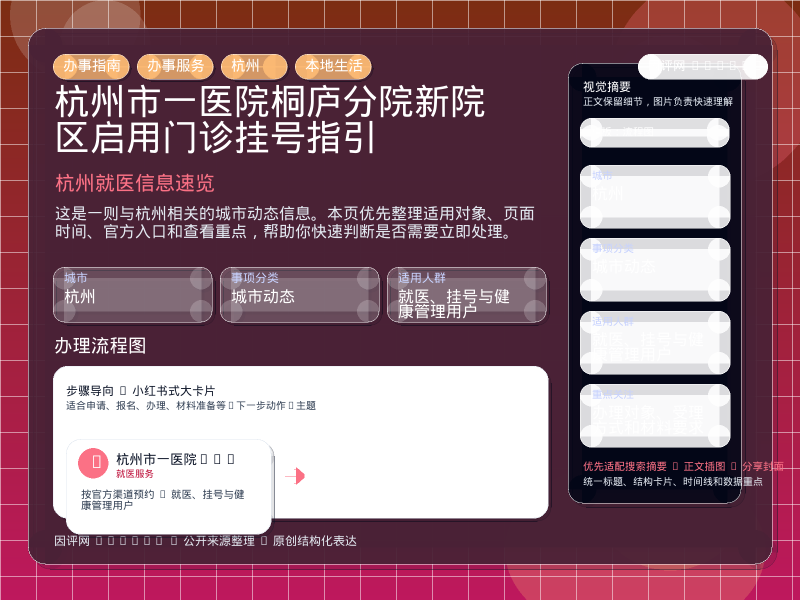 这项信息由 杭州门户政务资讯 发布,围绕“杭州市一医院桐庐分院新院区启用门诊挂号指引”整理为便于直接查看的本地生活页。进入页面后,先看自己是否属于适用对象,再看办理对象、受理方式和材料要求。