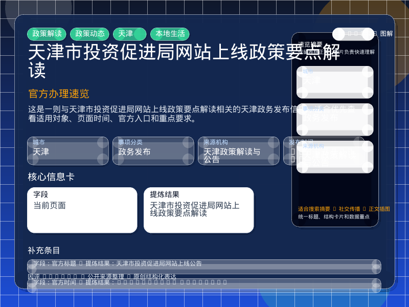 核心结论天津政务发布整理,围绕“天津市投资促进局网站上线公告”提炼为可检索、可阅读的原创结构化内容,优先展示时间、对象、入口和行动建议,来源:天津政策解读与公告。