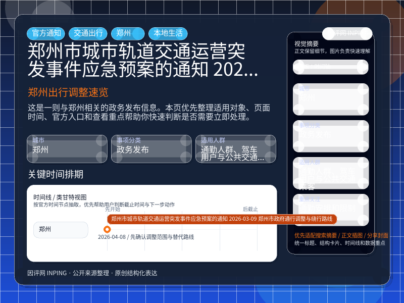 郑州政务发布整理,围绕“郑州市人民政府办公室关于印发郑州市城市轨道交通运营突发事件应急预案的通知 2026-03-09 [郑州市政府]”提炼为可检索、可阅读的原创结构化内容,优先展示时间、对象、入口和行动建议,来源:郑州政府文件。