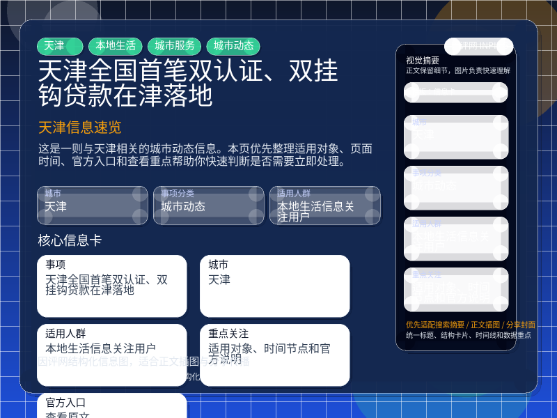 天津城市动态整理,围绕“全国首笔双认证、双挂钩贷款在津落地”提炼为可检索、可阅读的原创结构化内容,优先展示时间、对象、入口和行动建议,来源:天津门户焦点与动态。