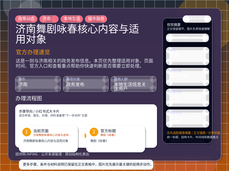 这项信息由 济南政府网首页聚合 发布,围绕“济南舞剧咏春核心内容与适用对象”整理为便于直接查看的本地生活页。进入页面后,先看自己是否属于适用对象,再看政策重点和官方说明。