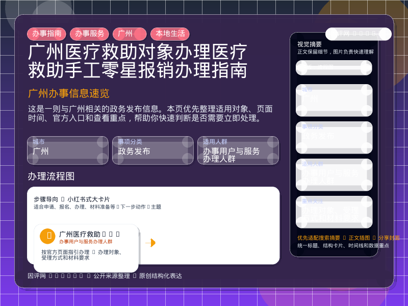 这项信息由 广州通知公告 发布,围绕“广州医疗救助对象办理医疗救助手工零星报销办理指南”整理为便于直接查看的本地生活页。进入页面后,先看自己是否属于适用对象,再看办理对象、受理方式和材料要求。