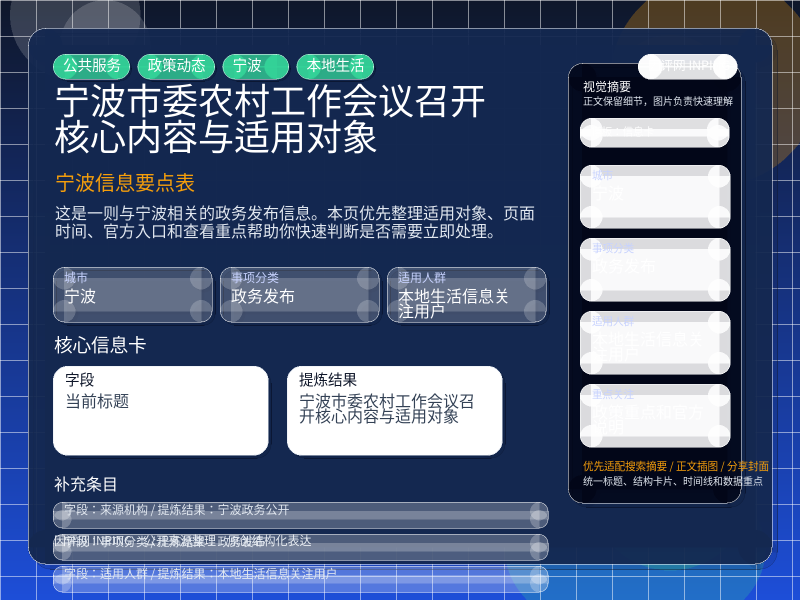 这项信息由 宁波政务公开 发布,围绕“宁波市委农村工作会议召开核心内容与适用对象”整理为便于直接查看的本地生活页。进入页面后,先看自己是否属于适用对象,再看政策重点和官方说明。