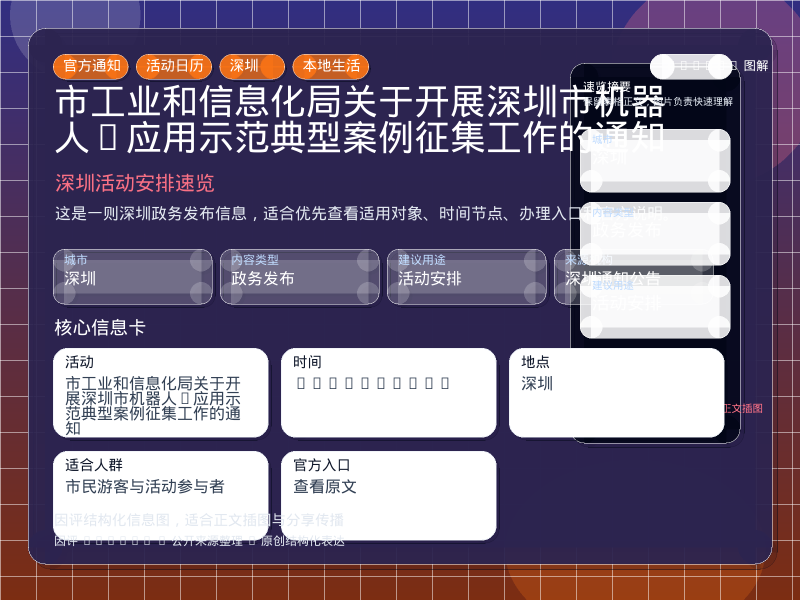 这条信息面向 政务发布 场景,由 深圳通知公告 公开发布,核心主题是“市工业和信息化局关于开展深圳市“机器人+”应用示范典型案例征集工作的通知”。因评基于公开元数据做了结构化整理,方便用户快速判断是否与当前需求相关。