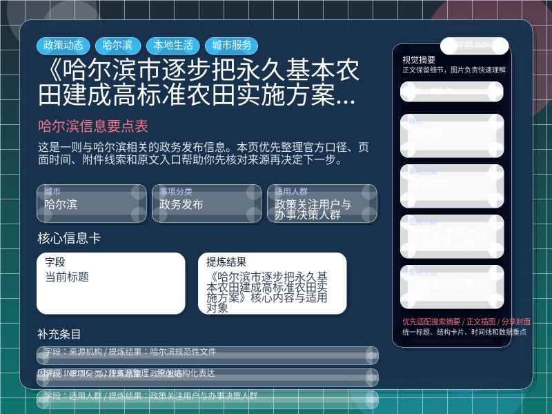 哈尔滨政务发布整理,围绕“哈尔滨市人民政府办公厅关于印发哈尔滨市逐步把永久基本农田建成高标准农田实施方案的通知”提炼为可检索、可阅读的原创结构化内容,优先展示时间、对象、入口和行动建议,来源:哈尔滨规范性文件。