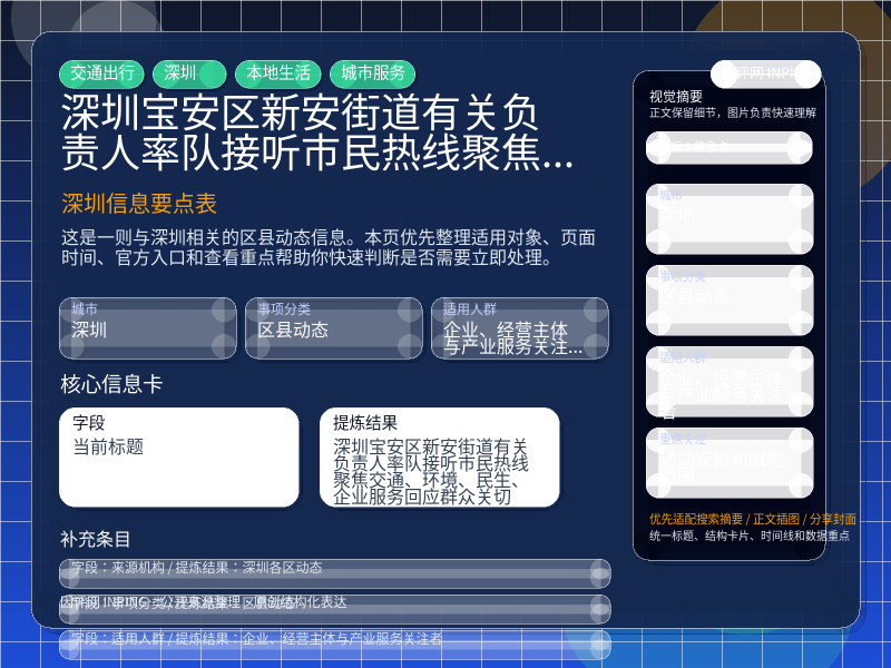 这项信息由 深圳各区动态 发布,围绕“深圳宝安区新安街道有关负责人率队接听市民热线,聚焦交通、环境、民生、企业服务回应群众关切”整理为便于直接查看的本地生活页。进入页面后,先看自己是否属于适用对象,再看通勤安排和限制范围。