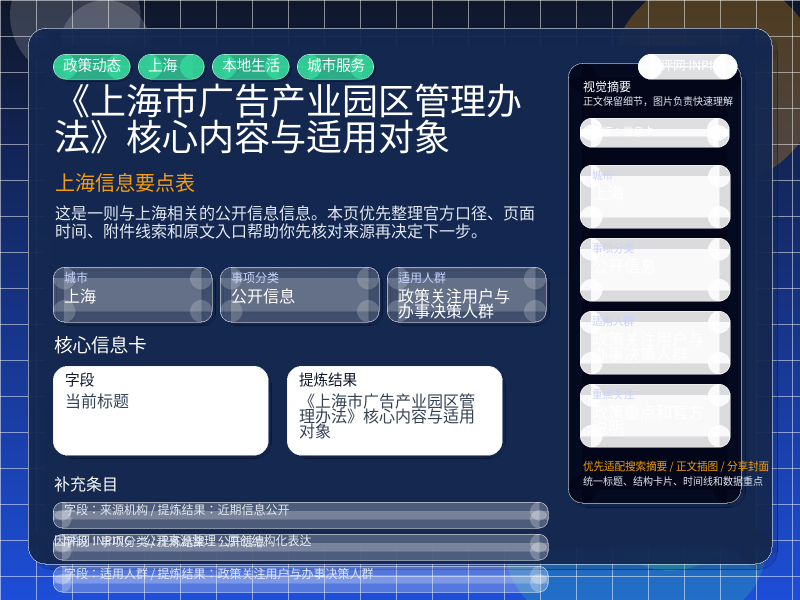 这项信息由 近期信息公开 发布,围绕“《上海市广告产业园区管理办法》核心内容与适用对象”整理为官方口径优先的本地生活页。进入页面后,先核对原文入口、页面时间和附件,再看政策重点和官方说明。