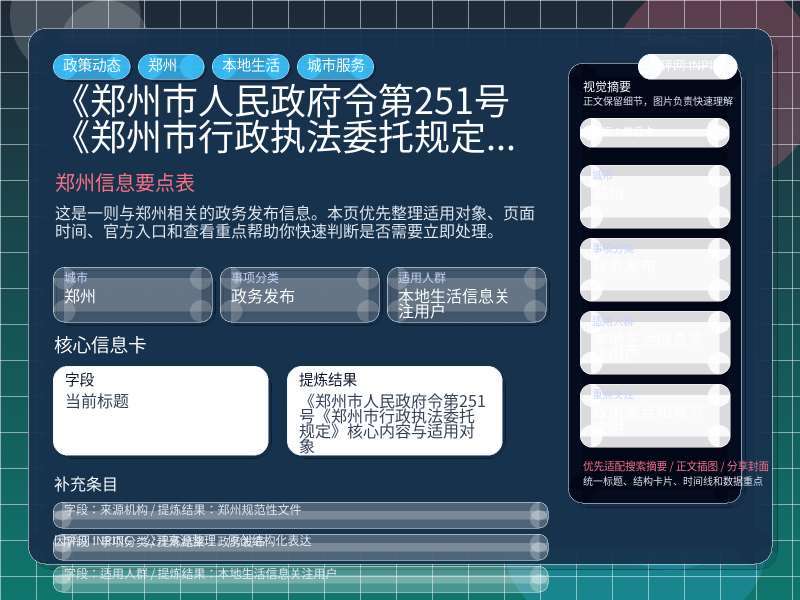 这条信息当前更适合 本地生活信息关注用户 重点关注。如果你正准备处理“《郑州市人民政府令第251号《郑州市行政执法委托规定》核心内容与适用对象”相关事项,建议先结合自身身份、所属行业或所在区域判断是否属于适用对象。